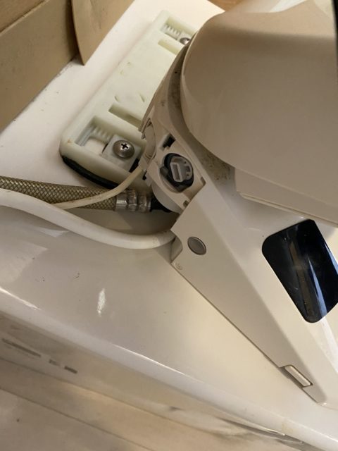 これは便座側で端子を引き抜き、撤去するのは簡単ですが、逆に、新しいモーターのケーブルを同じところに差し込むのが非常に難しい。