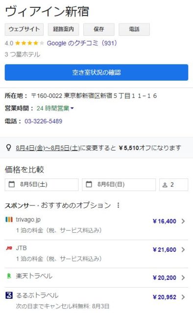 また、これらの宿泊サイトを横断的に検索する、トリバゴは、サイトごとに異なる金額を一発でチェックできる点でとても便利です。