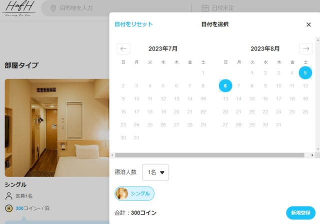 たとえば、人気のホテル「ヴィアイン新宿」の8/5(土)~8/6(日)のシングル1泊を見ると、最安値は16,400円ですが、HafH(ハフ)を使えば、300コイン=9,800円で宿泊できることになります!